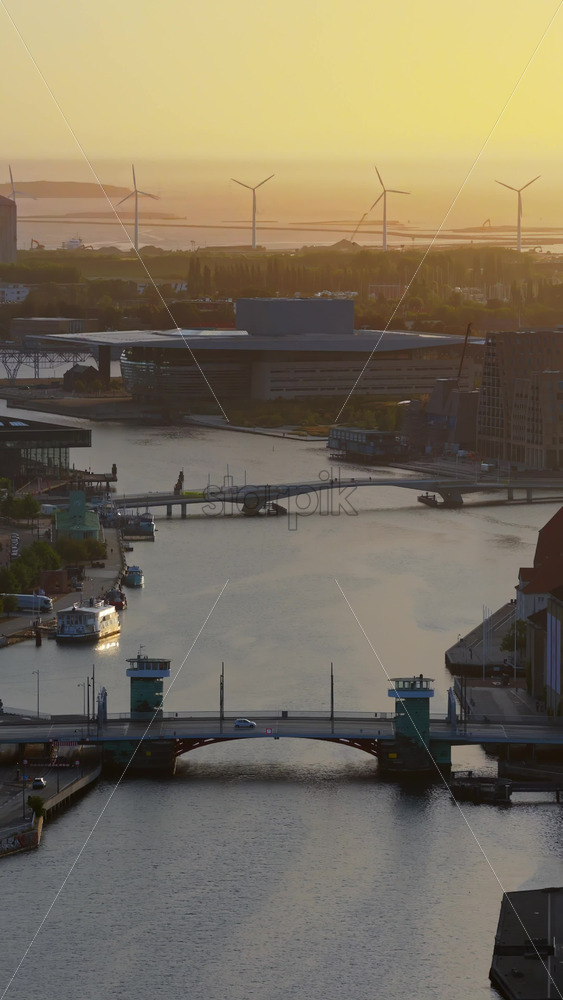 Aerial drone view of Copenhagen’s canals and bridges at sunrise, with golden light illuminating the city and harbor. Vertical Royalty Free Stock Video Footage