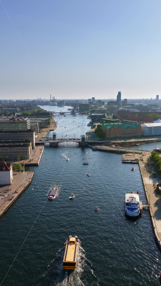 Aerial drone view of Copenhagen’s harbor, featuring canals, bridges, and boats, with the yellow harbor bus cruising through the water. Vertical Royalty Free Stock Video Footage