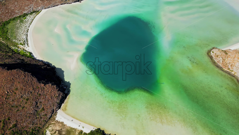 Aerial drone view of a coastal lagoon with turquoise and green tones surrounded by dry rocky hills and vegetation in Baja California Sur Royalty Free Stock Video Footage