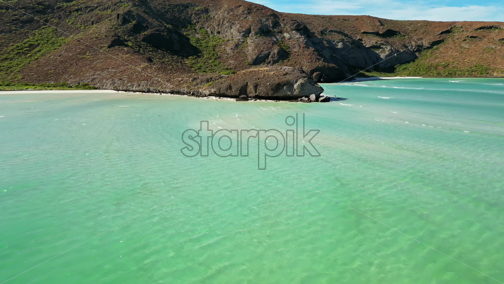 Aerial drone view of crystal clear blue waters with desert mountains in the background along the Baja California coast Royalty Free Stock Video Footage