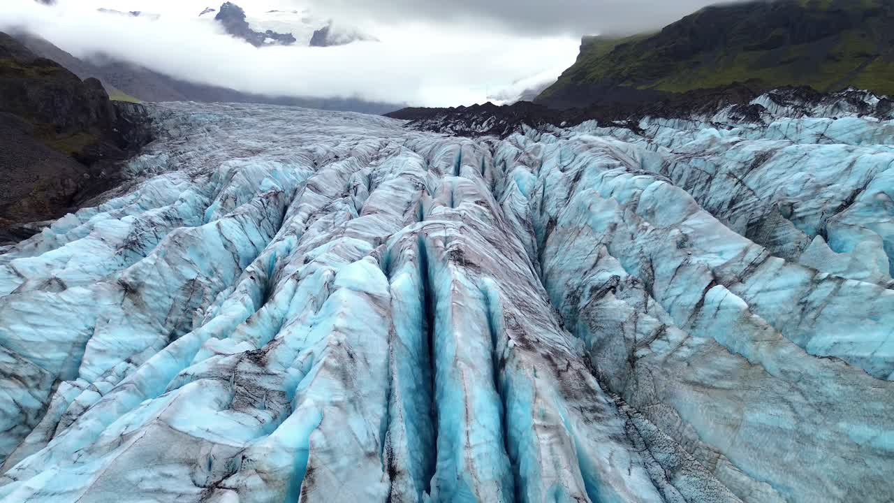 Aerial drone view of deep crevasses of Falljokull glacier, an outlet of Vatnajokull in South Iceland. Dramatic blue ice ridges and dark volcanic ash streaks create powerful Arctic landscape scenery under cloudy sky Royalty Free Stock Video Footage