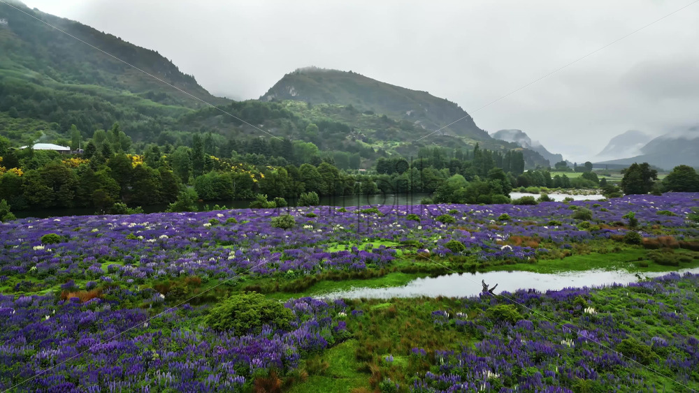 Aerial drone view of a Patagonian valley covered in purple wildflowers Royalty Free Stock Video Footage