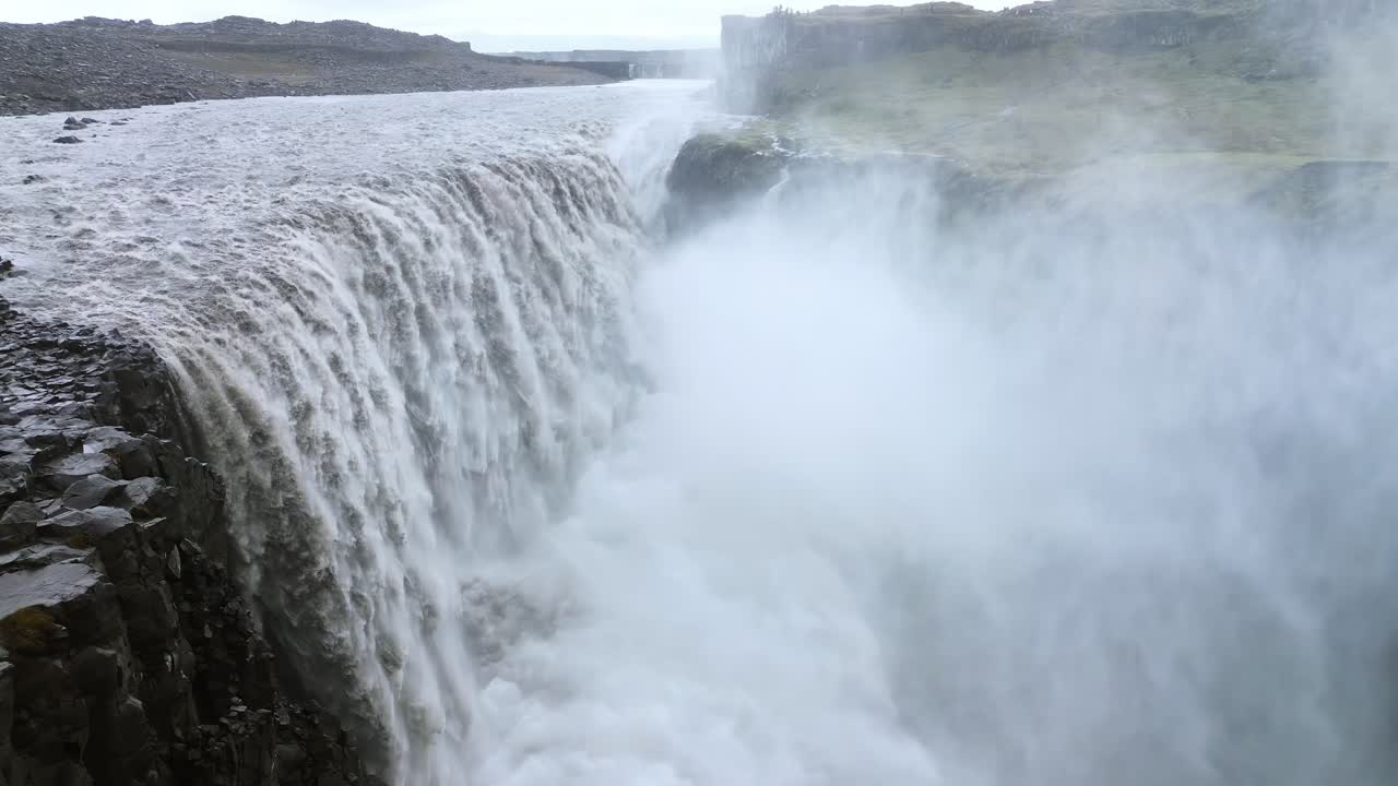 Video – Aerial drone view of Dettifoss waterfall in Vatnajokull National Park, Northeast Iceland. Europe’s most powerful waterfall crashes into a mist filled canyon with roaring white water and dramatic volcanic rock cliffs