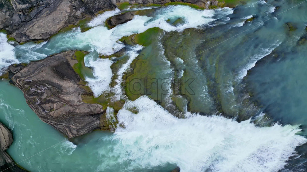 Aerial drone view of fast flowing glacial river cutting through rocky terrain, showing vivid turquoise water and white foam Royalty Free Stock Video Footage