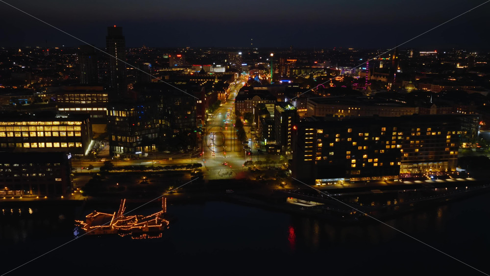 Home » Shop » 1 Video » Video – Aerial drone view of Islands Brygge and Copenhagen’s inner harbor with colourful reflections on the water and the Tivoli Gardens at night in Denmark