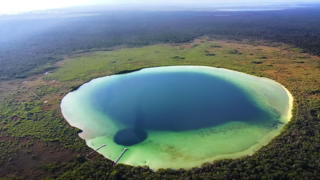 Aerial drone view of Kaan Luum Lagoon circular cenote surrounded by tropical jungle in Tulum, Mexico, showing deep blue center and shallow turquoise water Royalty Free Stock Video Footage