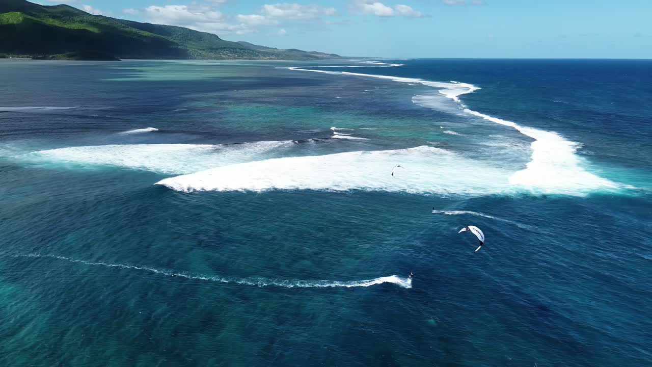 Aerial drone view of kitesurfers riding waves near the coral reef barrier in Mauritius, with deep blue ocean on one side and shallow turquoise lagoon on the other Royalty Free Stock Video Footage
