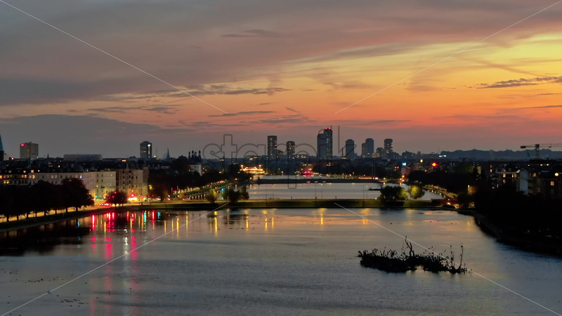 Video Aerial drone view of the Nyhavn waterfront, canal and entertainment district in Copenhagen, Denmark in the evening Royalty Free Stock Video Footage