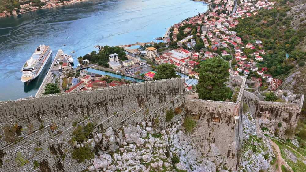 Aerial drone view of Kotor’s ancient fortress walls perched on the mountainside, overlooking the town and the bay far below Royalty Free Stock Video Footage