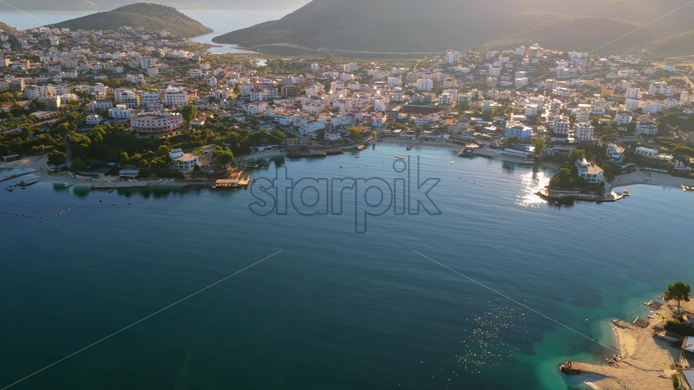Aerial drone view of Ksamil town, it’s dense cluster of hotels and houses, and the iconic bright blue bays with floating platforms and beach clubs Royalty Free Stock Video Footage