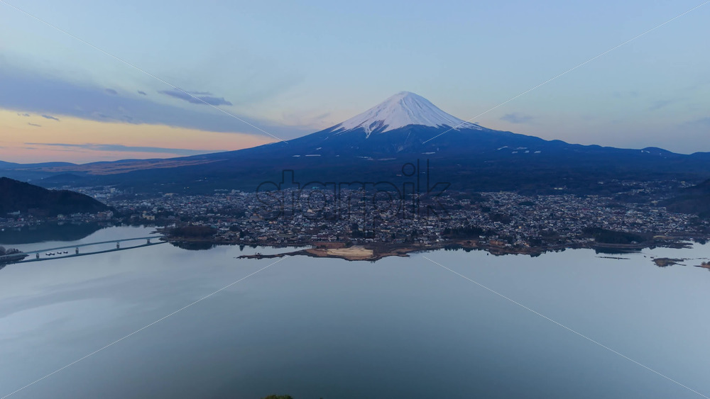 video Aerial drone view of Lake Kawaguchiko near the Fujikawaguchiko town, Japan with Mount Fuji on the background in the evening Royalty Free Stock Video Footage