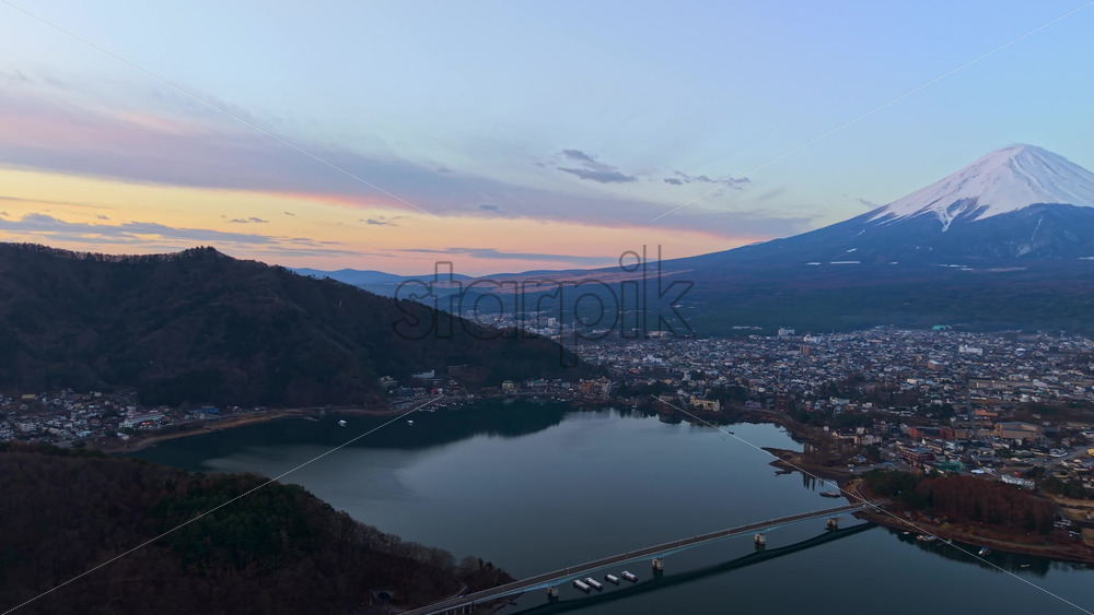 video Aerial drone view of Lake Kawaguchiko near the Fujikawaguchiko town, Japan with Mount Fuji on the background in the evening Royalty Free Stock Video Footage