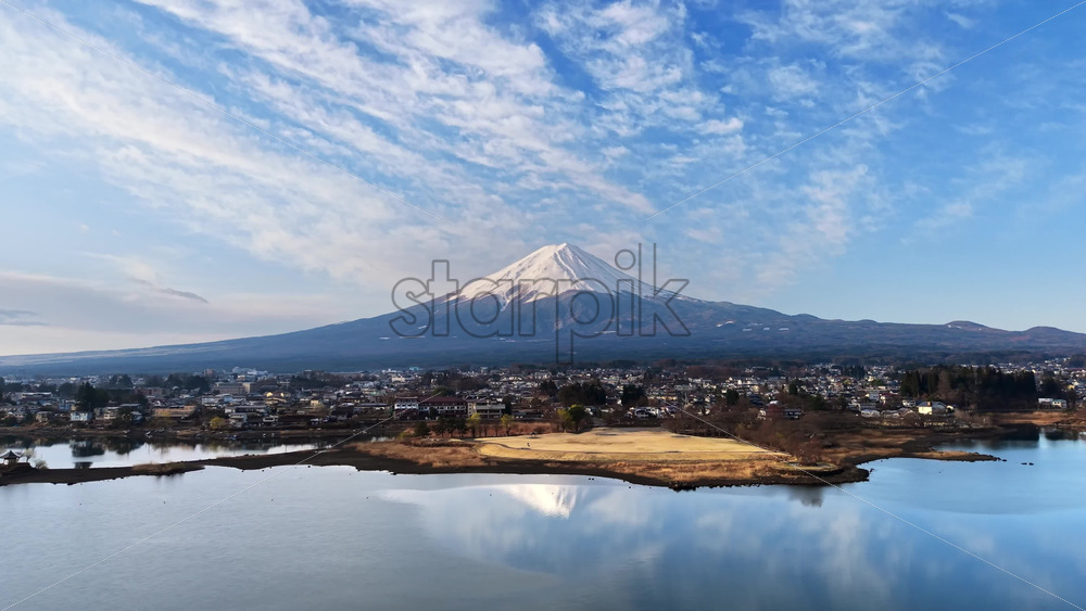 video Aerial drone view of Lake Kawaguchiko near the Fujikawaguchiko town, Japan with Mount Fuji on the background in the evening Royalty Free Stock Video Footage