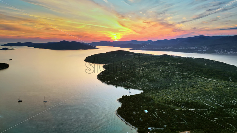 VIDEO Aerial, drone view of land on the shore of the Adriatic sea in Croatia, at sunset Royalty Free Stock Video Footage