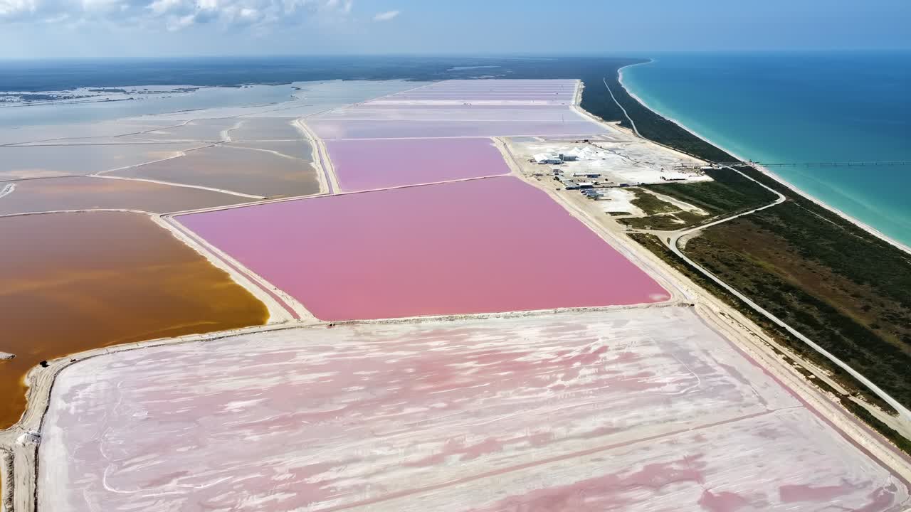 Video – Aerial drone view of Las Coloradas pink salt lakes on the Yucatan Peninsula, Mexico, showing geometric salt evaporation ponds with vivid pink water near the Caribbean coastlin