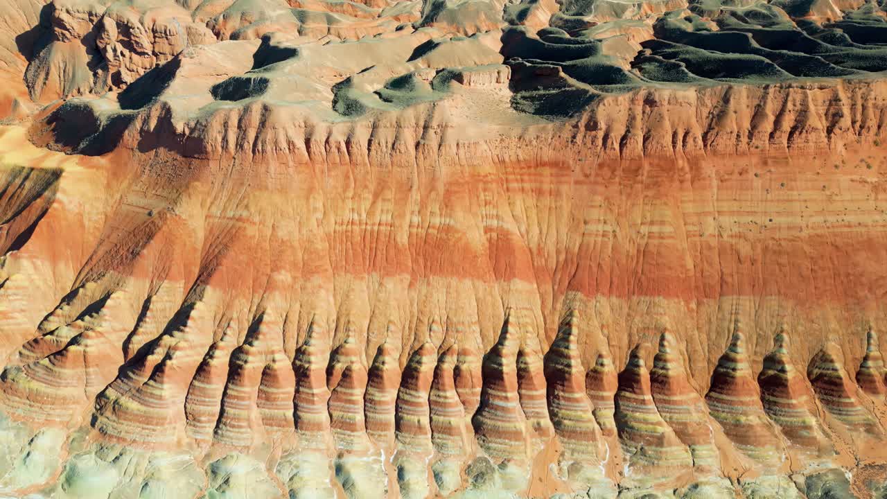 Aerial drone view of layered sandstone cliff formations in Zhangye Danxia Geopark, Gansu Province, China Royalty Free Stock Video Footage