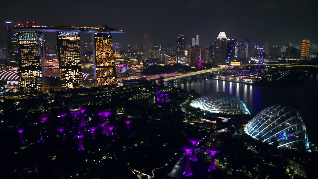 Aerial drone view of Marina Bay in Singapore at night showing Marina Bay Sands, the Singapore Flyer observation wheel, and illuminated waterfront skyline Royalty Free Stock Video Footage