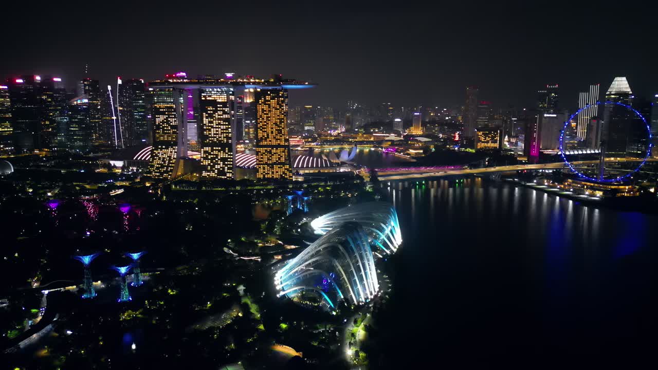 Aerial drone view of Marina Bay in Singapore at night showing Marina Bay Sands, the Singapore Flyer observation wheel, and illuminated waterfront skyline Royalty Free Stock Video Footage