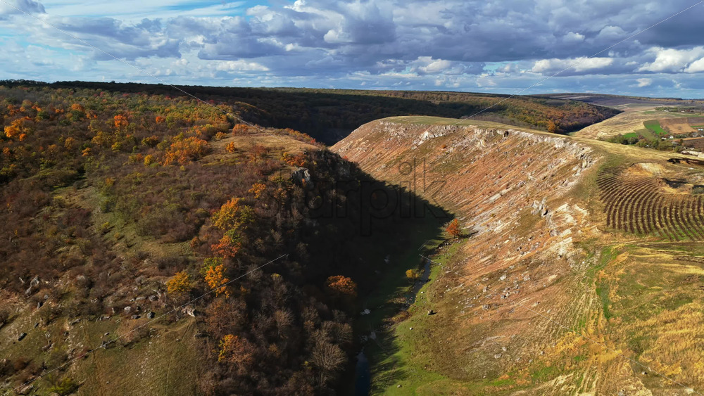 Aerial drone view of Moldova’s hilly canyon landscape, with patches of autumn trees and winding trails Royalty Free Stock Video Footage