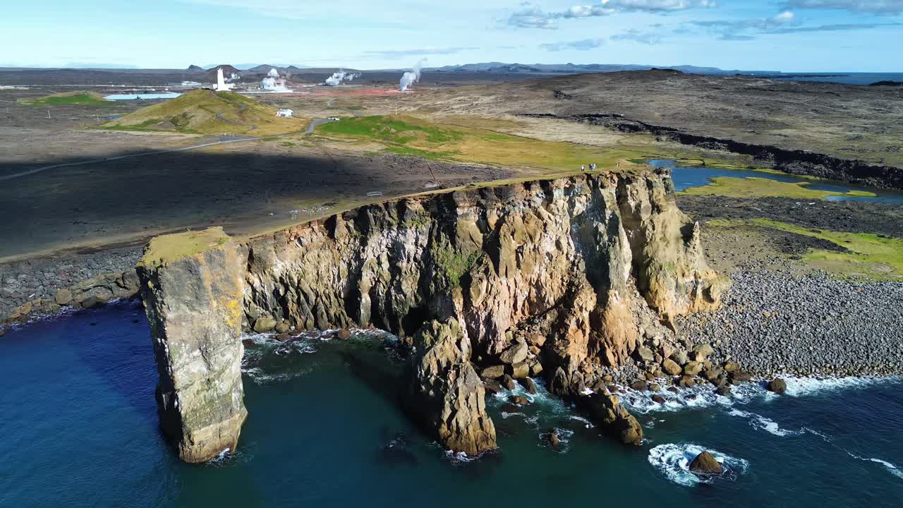 Aerial drone view of moss covered coastal cliffs and a rocky beach along Iceland’s volcanic shoreline. Turquoise ocean waves break against the steep basalt cliffs Royalty Free Stock Video Footage