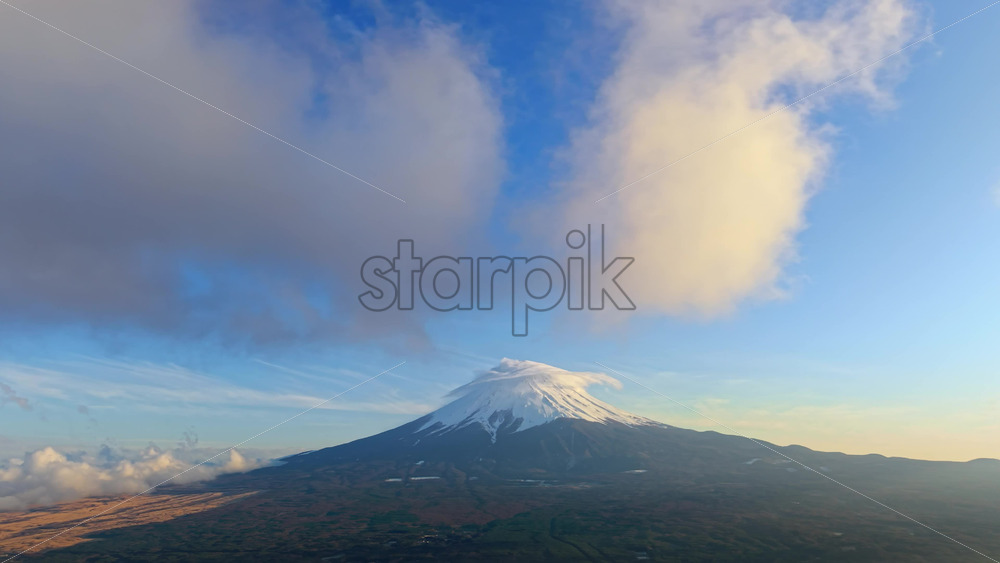 video Aerial drone view of Mount Fuji with snow at the top and clouds moving around in daylight Royalty Free Stock Video Footage