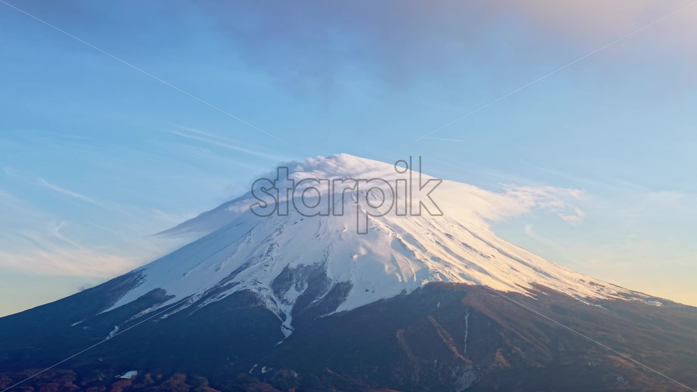 video Aerial drone view of Mount Fuji with snow at the top and clouds moving around in daylight Royalty Free Stock Video Footage