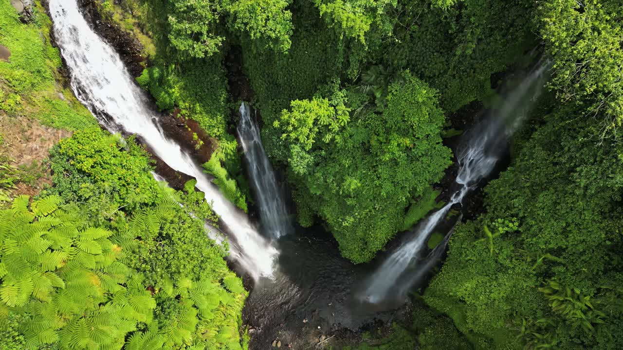 Video – Aerial drone view of multiple cascades at Sekumpul Waterfall in North Bali, Indonesia. Tall white streams flow down steep rainforest cliffs covered in vibrant green vegetation