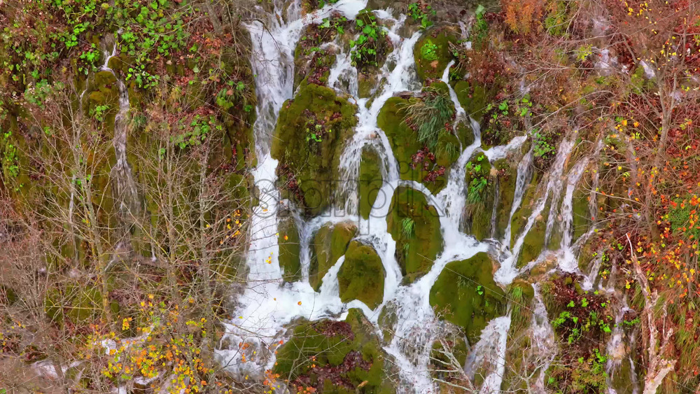 Aerial drone view of cascading waterfalls flowing over moss covered cliffs and lush vegetation in Plitvice Lakes National Park, Croatia Royalty Free Stock Video Footage