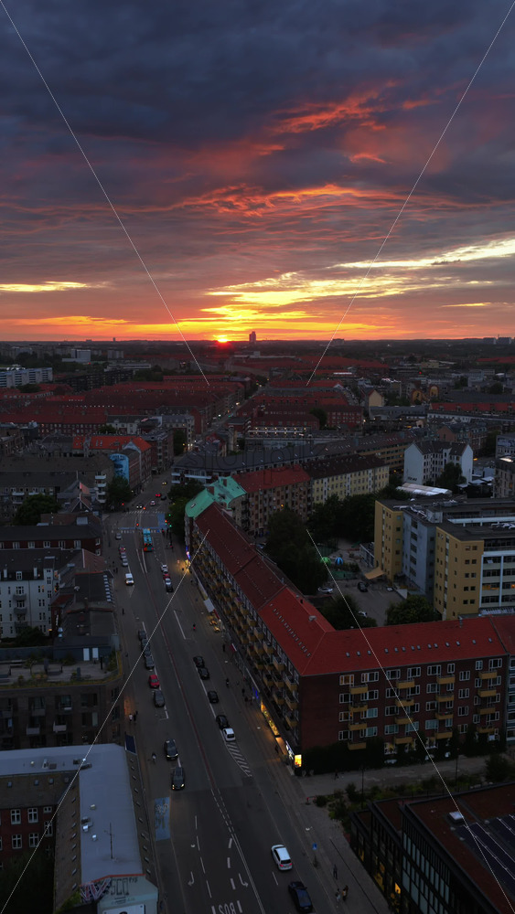 Aerial drone view of of Norrebro rooftops and streets during sunset, with dramatic golden sky over Copenhagen, Denmark. Vertical Royalty Free Stock Video Footage