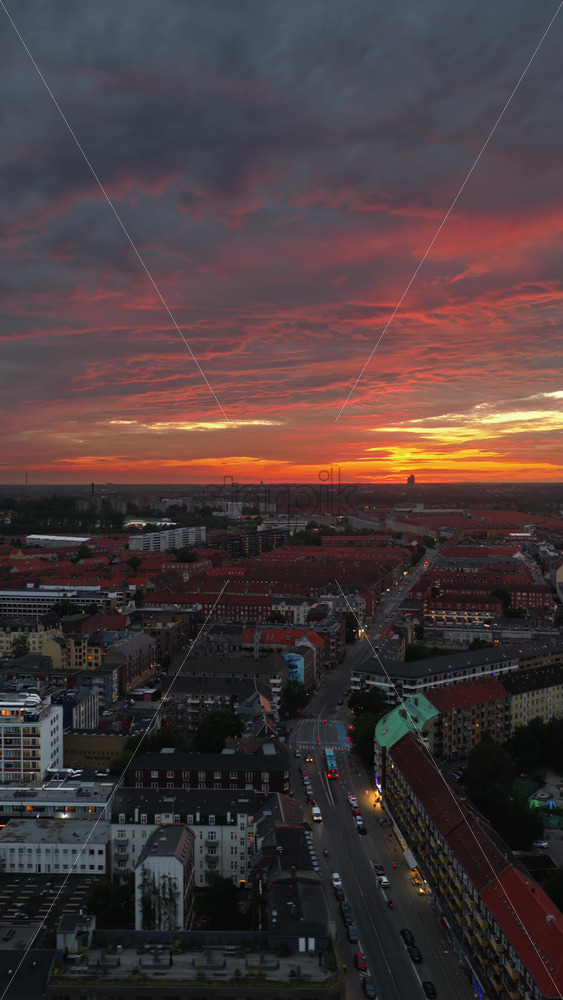 Aerial drone view of of Norrebro rooftops and streets during sunset, with dramatic golden sky over Copenhagen, Denmark. Vertical Royalty Free Stock Video Footage