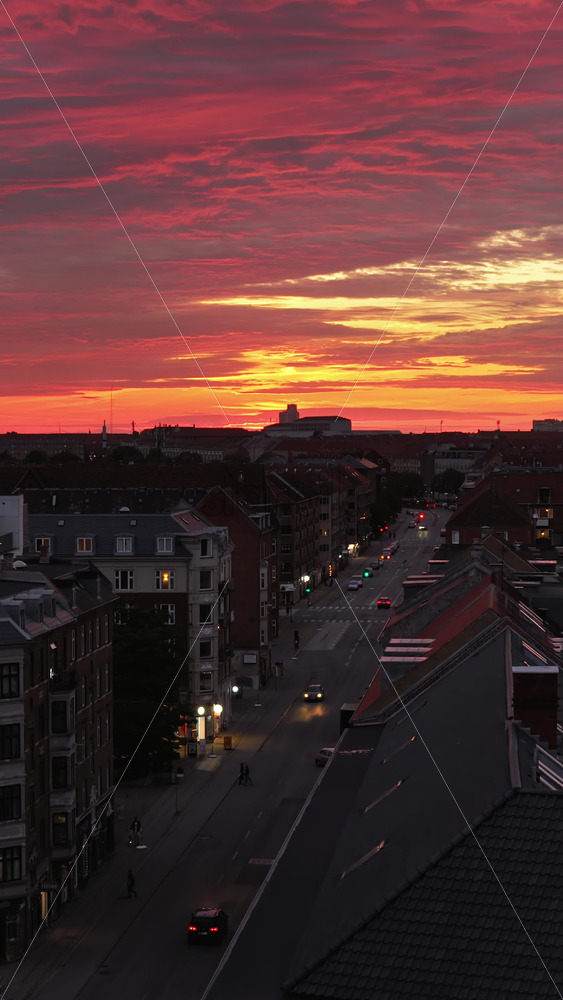 Aerial drone view of of Norrebro rooftops and streets during sunset, with dramatic golden sky over Copenhagen, Denmark. Vertical Royalty Free Stock Video Footage