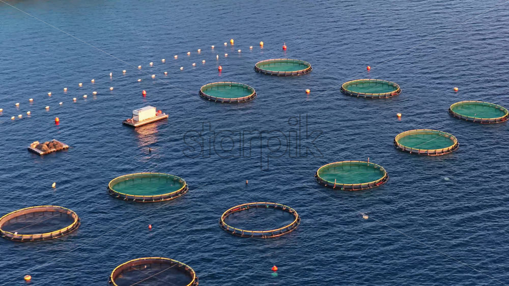 Aerial drone view of offshore aquaculture cages near Tribunj, Croatia, arranged in geometric circular patterns in the deep blue Adriatic Sea. Royalty Free Stock Video Footage