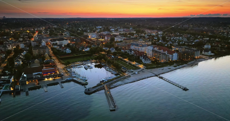 VIDEO Aerial drone view of Osterbo Nord, Nordhavn harbour area at the coast of the Oresund in the evening Royalty Free Stock Video Footage