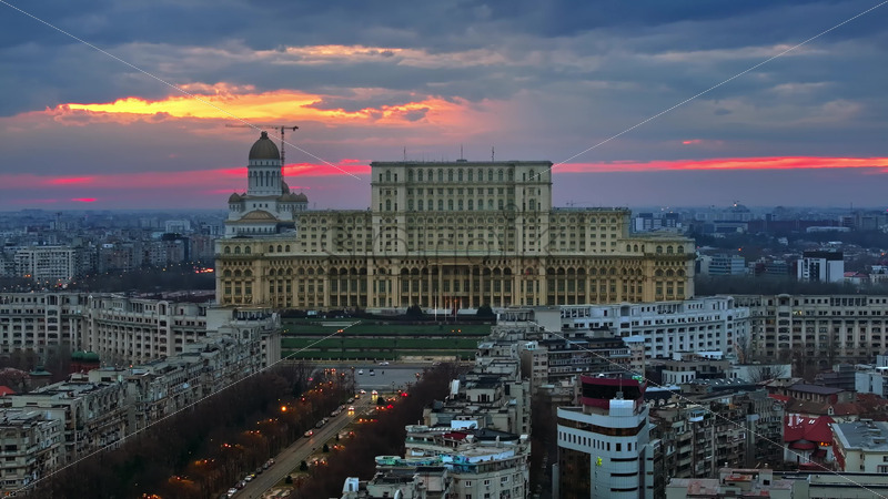VIDEO Aerial drone view of Palace of the Parliament in Bucharest downtown at sunset. Romania Royalty Free Stock Video Footage