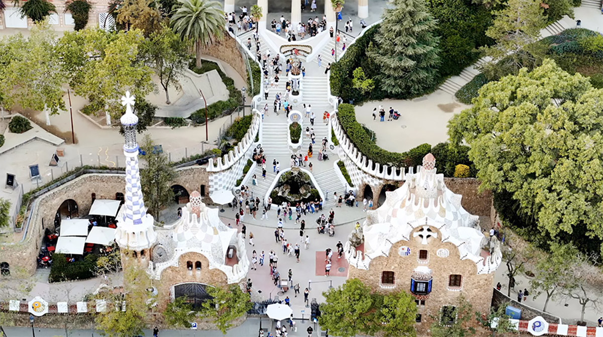 Aerial drone view of Park Guell. Antoni Gaudi architecture. A lot of greenery around, tourists Royalty Free Stock Video Footage