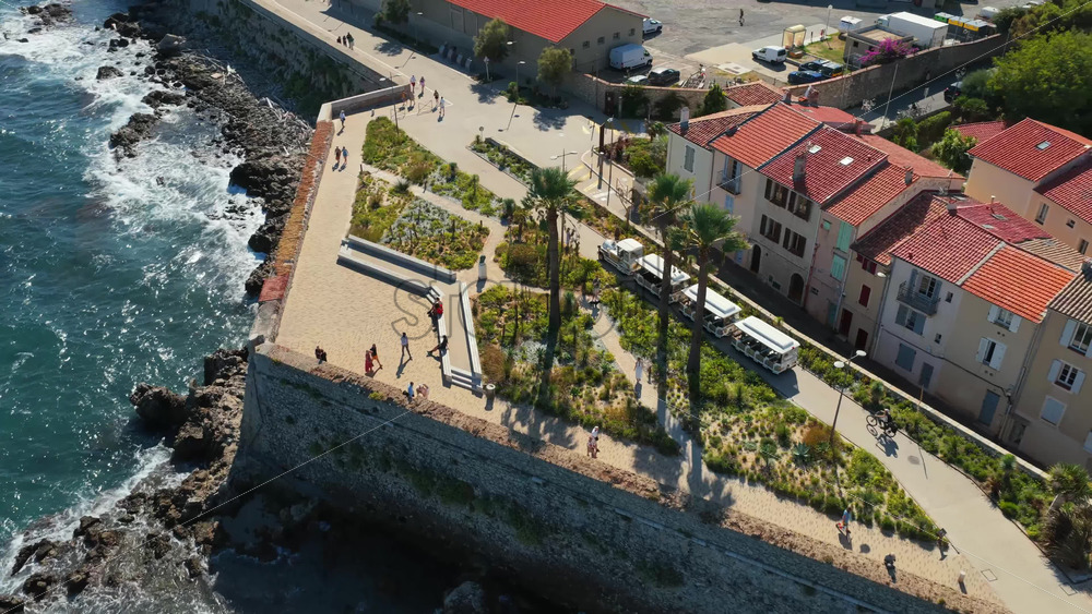 Aerial drone view of people walking along the Antibes Old Town ramparts, with palm trees, landscaped gardens, and waves crashing against the rocky coast Royalty Free Stock Video Footage