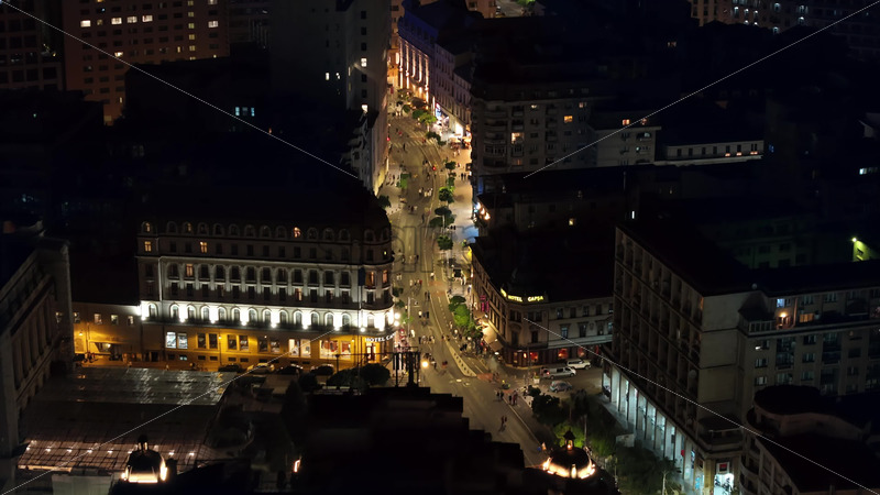 VIDEO Aerial drone view of people walking on the streets of Bucharest, Romania at night Royalty Free Stock Video Footage
