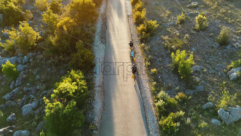 VIDEO Aerial, drone view of people with yellow backpacks biking on the road in Albania Royalty Free Stock Video Footage