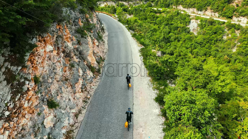 Home » Shop » 1 Video » people » Video Aerial, drone view of people with yellow backpacks biking on the road in Bosnia and Herzegovina