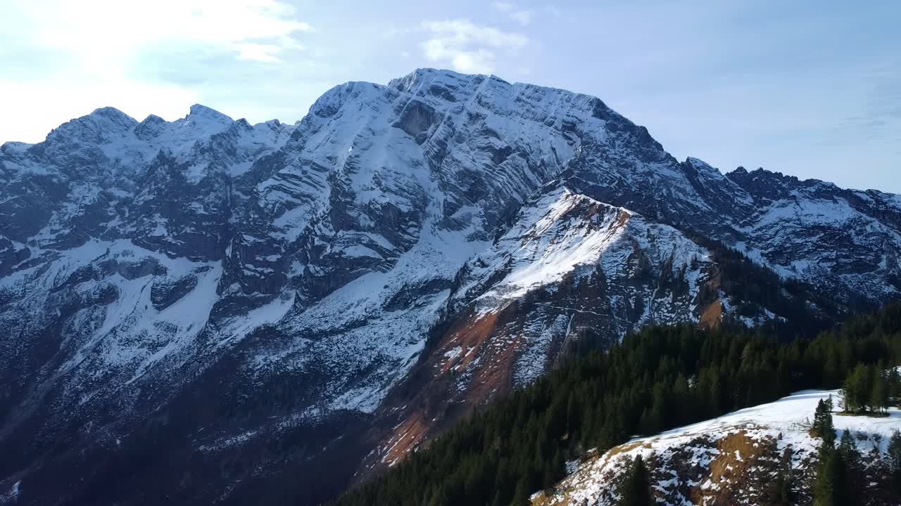 Aerial drone view of rugged snow covered mountains in the Bavarian Alps, with forested slopes and dramatic alpine ridges under cold winter light Royalty Free Stock Video Footage