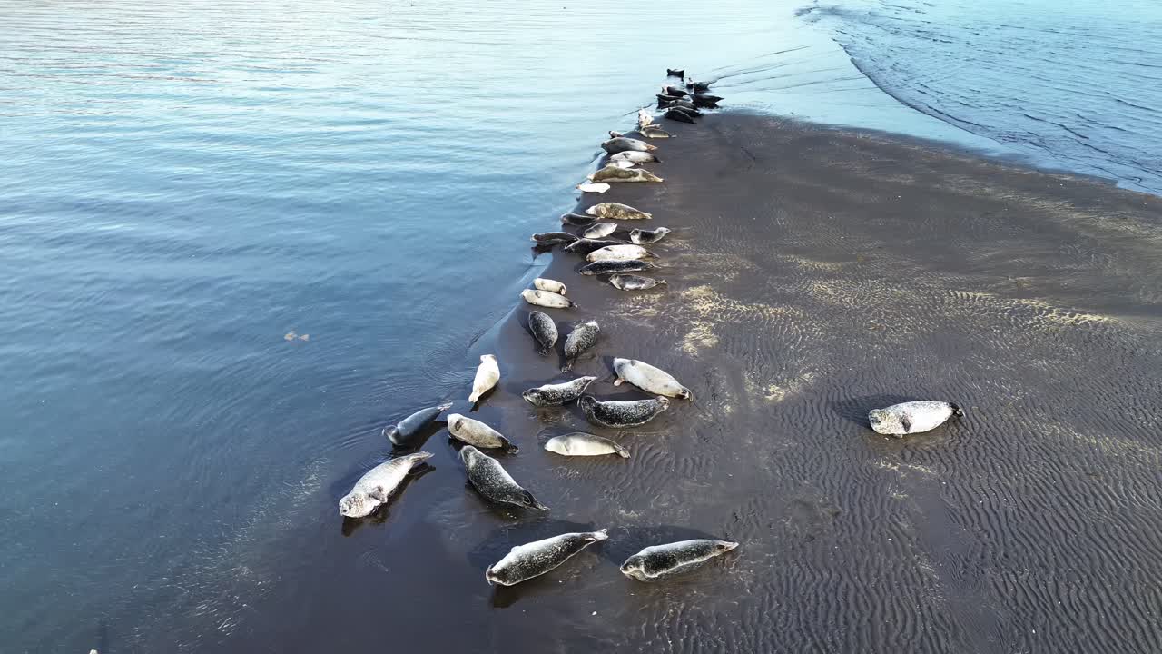Aerial drone view of seals resting on a black sand shoreline beside the calm waters of Jokulsaron Royalty Free Stock Video Footage