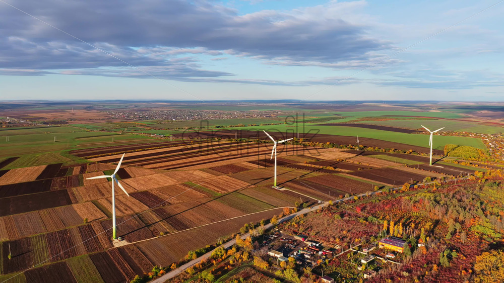 Aerial drone view of several wind turbines placed across Moldovan farmlands under a bright blue sky Royalty Free Stock Video Footage