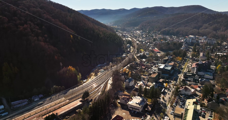 Video Aerial drone view of Sinaia, Romania, in the Bucegi Mountains, surrounded by ski trails Royalty Free Stock Video Footage