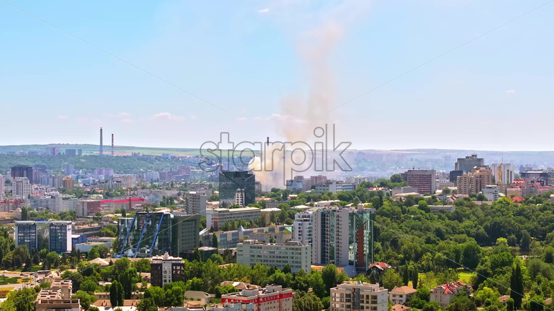 VIDEO Aerial drone view of smoke coming out of a building in Chisinau, Moldova Royalty Free Stock Video Footage