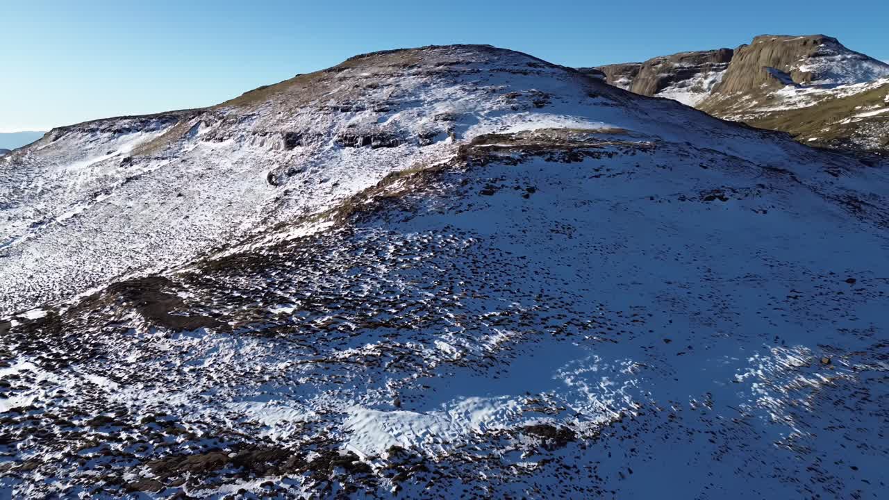 Aerial drone view of snow covering mountain slopes in the Lesotho highlands, with rugged terrain and winter landscape under clear blue skies Royalty Free Stock Video Footage
