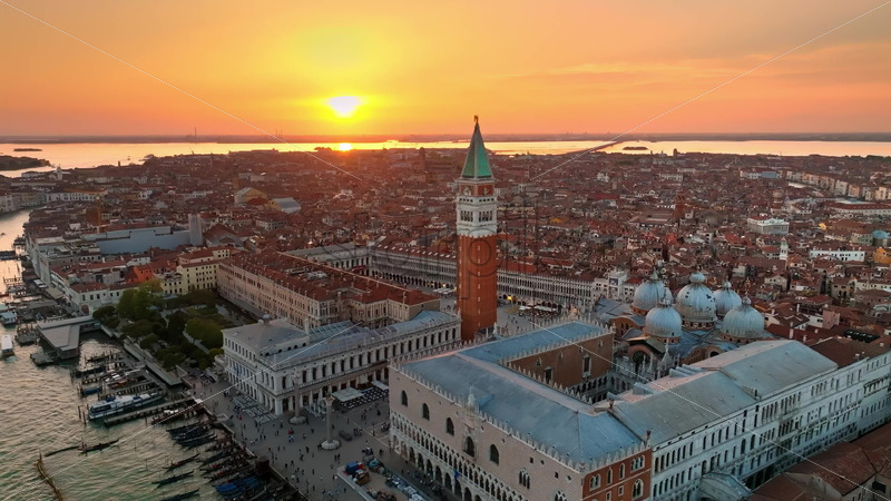 VIDEO Aerial drone view of St Mark’s Campanile with Venice, Italy on the background, at sunset Royalty Free Stock Video Footage