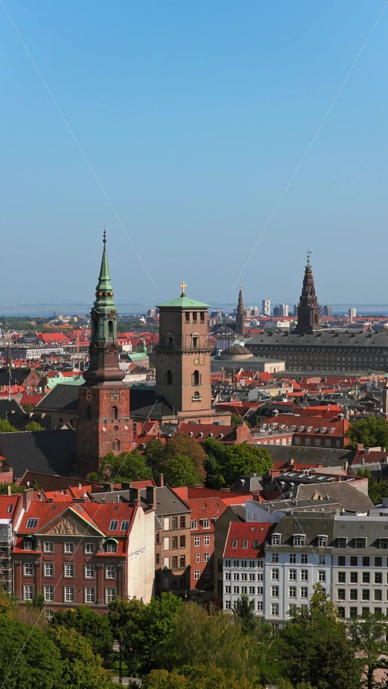 Aerial drone view of the colourful rooftops and canals of Copenhagen, with the Copenhagen City Hall tower standing prominently in the distance. Vertical Royalty Free Stock Video Footage