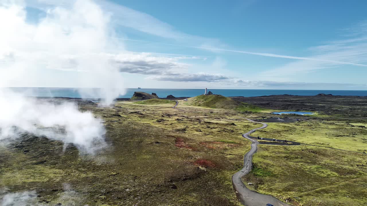 Aerial drone view of steaming geothermal vents across the rugged lava fields of the Reykjanes Peninsula. A winding road leads toward a lighthouse near the Atlantic Ocean under clear blue skies Royalty Free Stock Video Footage