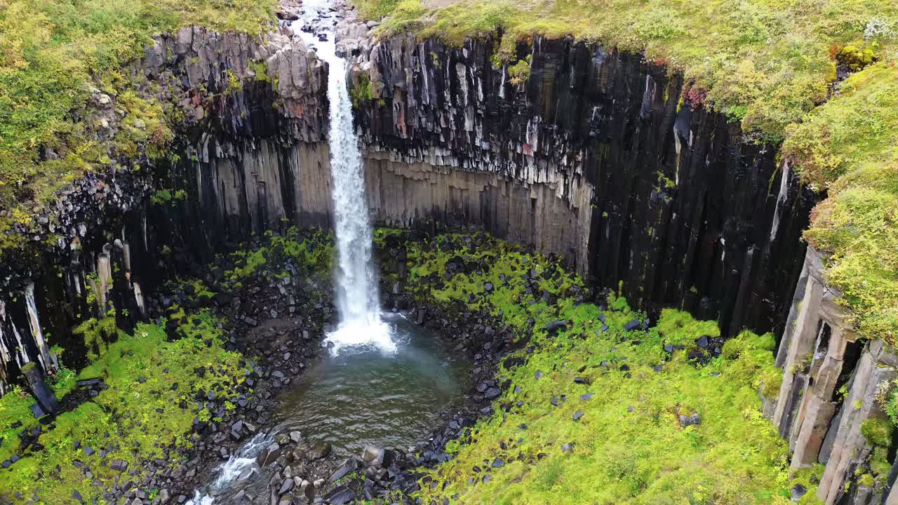 Aerial drone view of Svartifoss waterfall cascading down dramatic basalt column cliffs in Vatnajokull National Park, Iceland Royalty Free Stock Video Footage