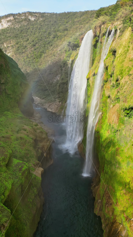 Aerial drone view of a stunning canyon with turquoise waterfalls and layered rock formations surrounded by green forest in Mexico. Vertical Royalty Free Stock Video Footage